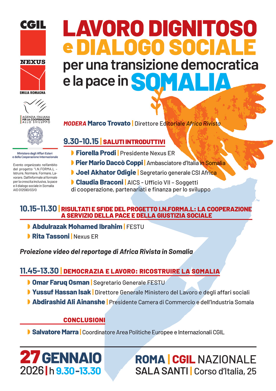 Il 27 gennaio ore 9.30-13.30 presso SALA SANTI, CGIL Nazionale, Corso d’Italia, 25 Roma si terrà il seminario “ Lavoro dignitoso e dialogo sociale per una transizione democratica e la pace in Somalia”